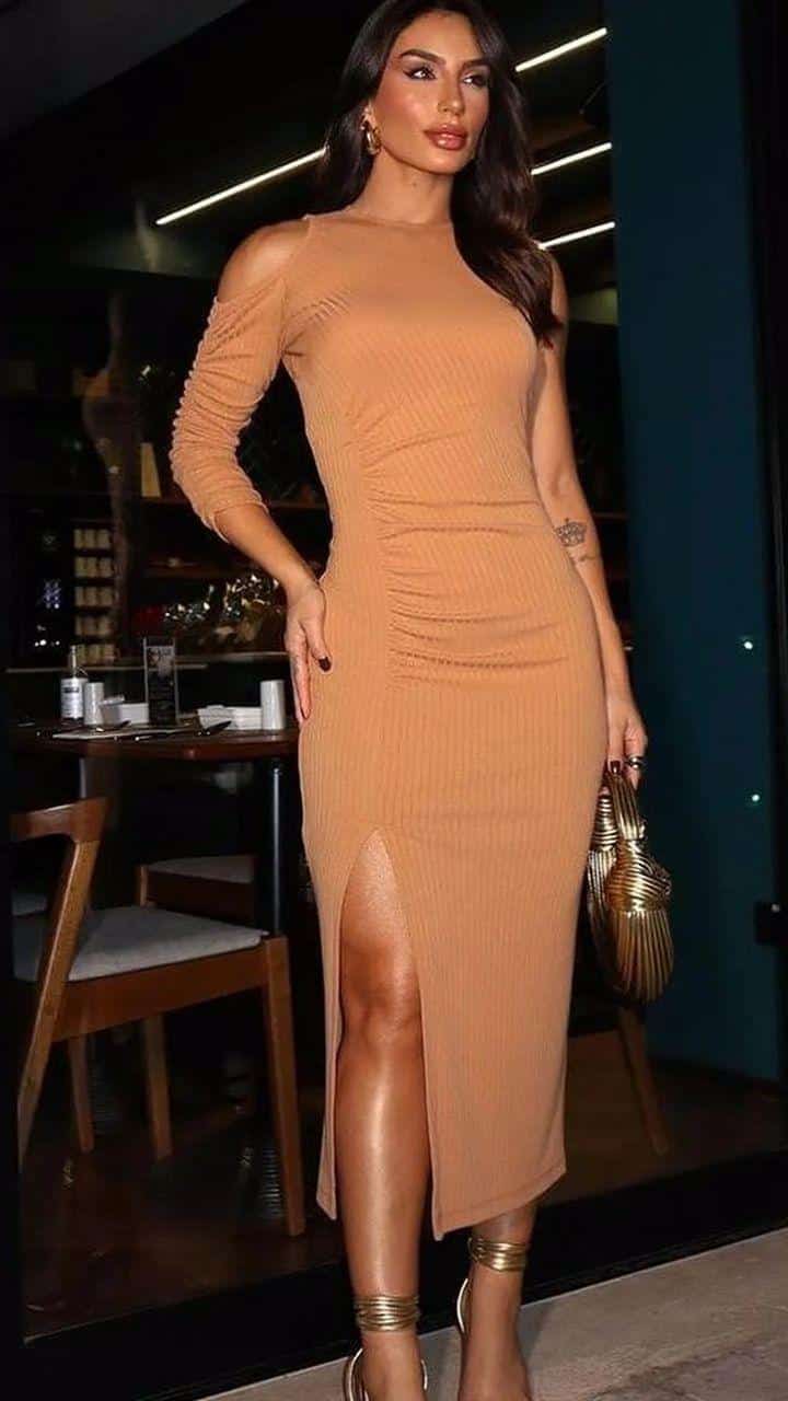 VESTIDO MAXI MIDI DRAPEADOS NA FRENTE E NA MANGA DOCE DE LEITE TAMANHO : M